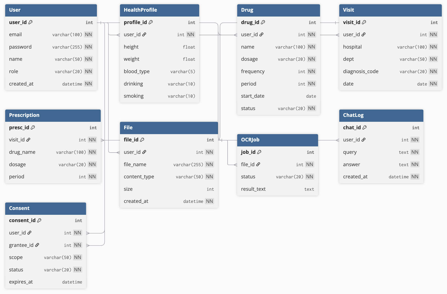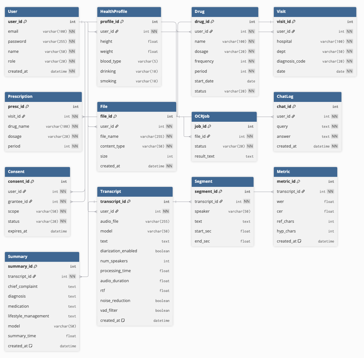 총 13개 테이블(User, HealthProfile, Drug, Visit, Prescription, File, OCRJob, ChatLog, Consent, Transcript, Segment, Metric, Summary)에 대해 다음 항목을 상세히 정의하였다.